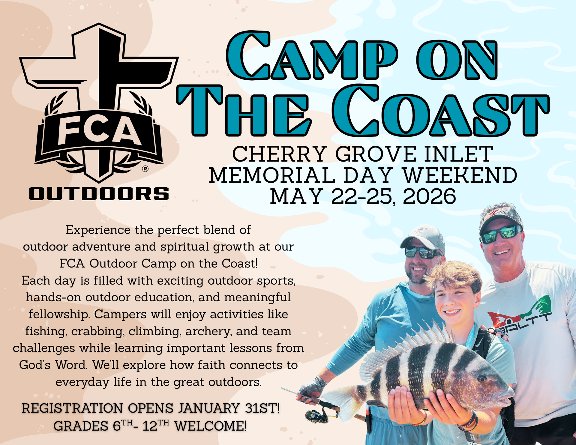 The FCA Outdoors Camp on the Coast will be prayerfully aiming to reach and serve students who love anything outdoors. We are offering kayaking, ropes course, fishing, crabbing, archery, volleyball, bonfire nights, and many other creative competitions. Outdoor education classes and skills will be offered again. Even if a kid does not have any outdoor sport experience, they will be able to find a new niche at this camp! Most importantly, being in the Lord's creation and in His word at the same time can and will touch hearts from young to old. His presence is undeniable when we are surrounded by it.