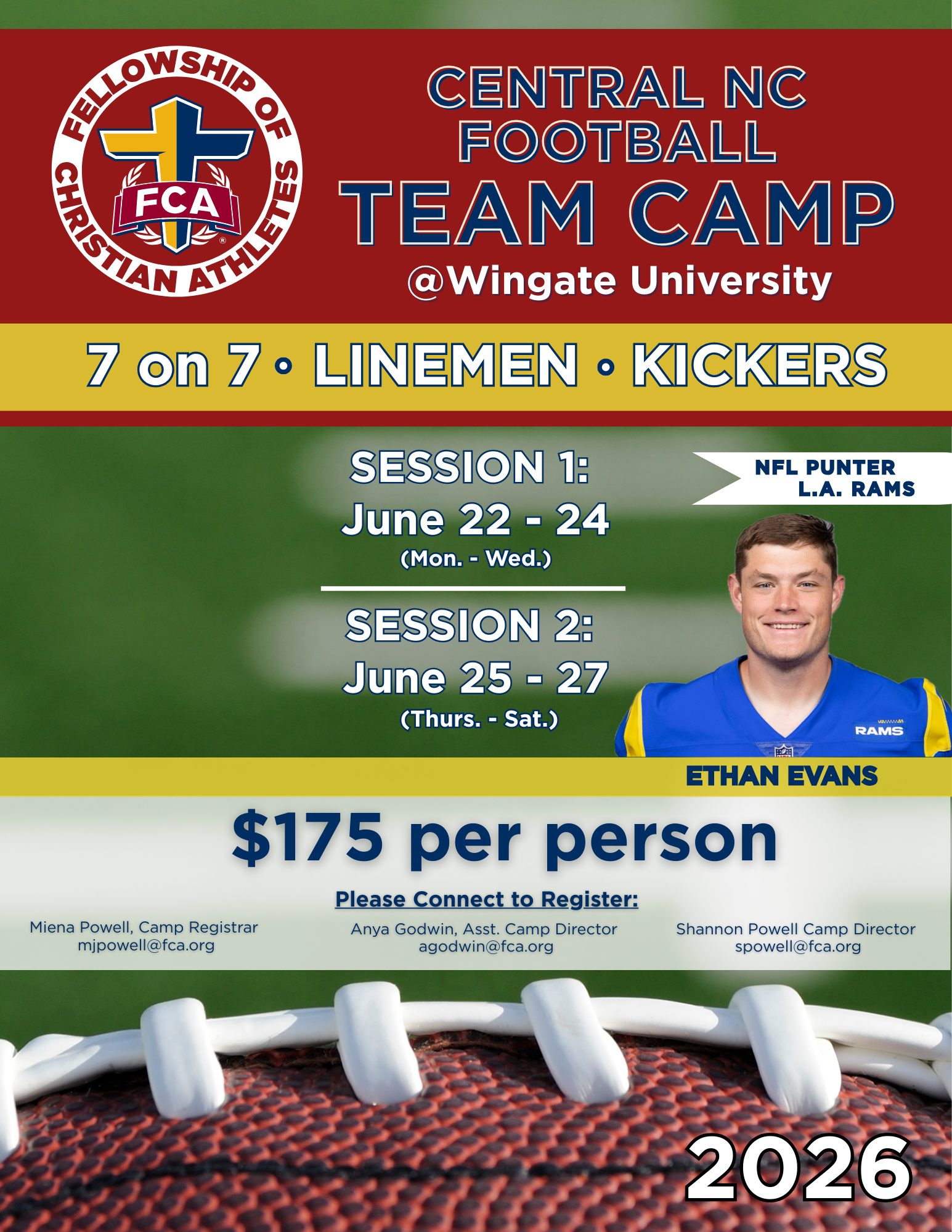 You can initially reserve your spot as a TEAM by immediately contacting our Camp Director, Shannon Powell at 704-574-1012 or by email at spowerll@fca.org. We need your best guess numbers of Coaches and Athletes attending.